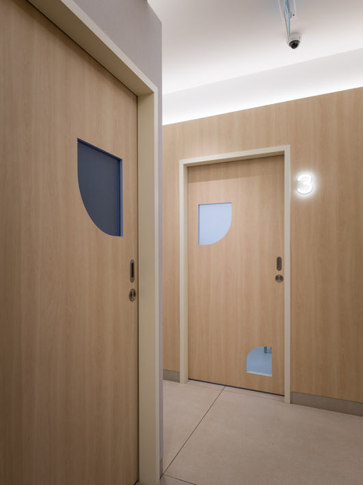 Various apertures in the space creates a sense of openness and in an otherwise clinical environment. Smaller openings are created at pet heights so that the pets will have a good view of the rooms too.